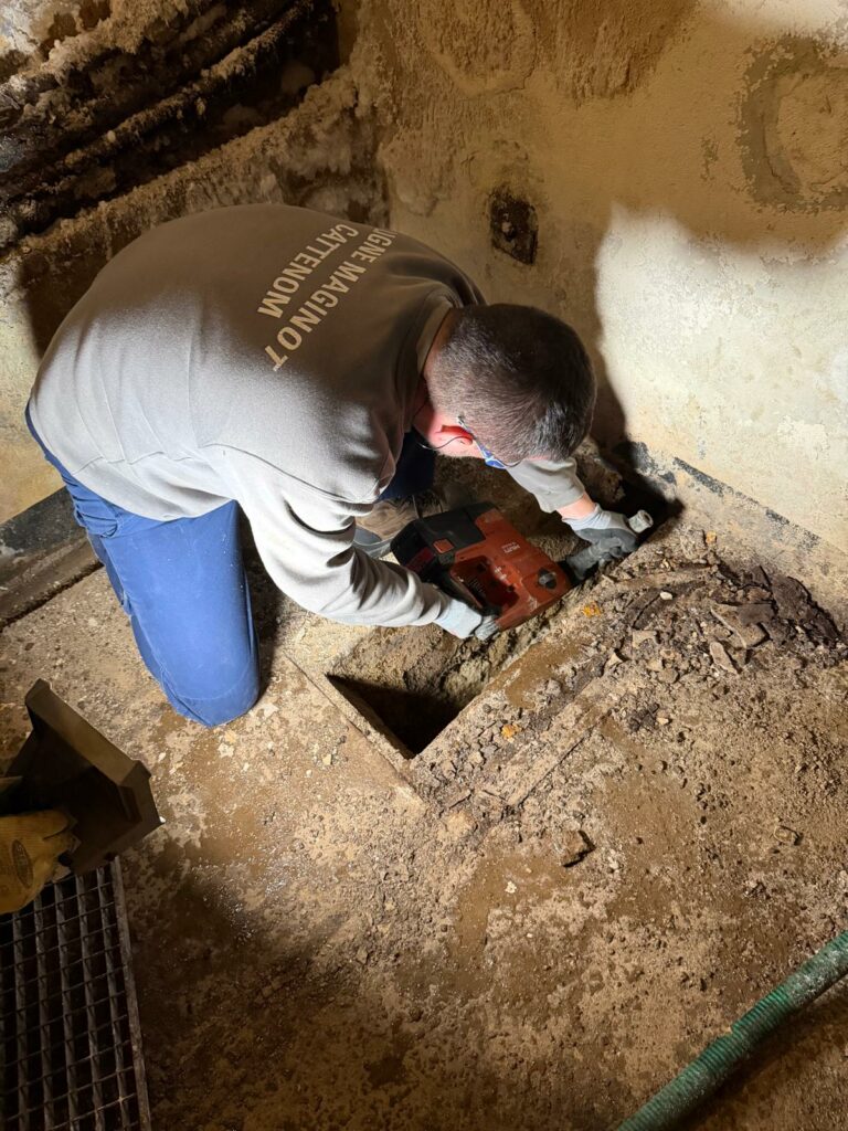 Bouchés par 90 ans de calcaire et de boue, certains écoulements ne se déversent plus vers l’égout principal du fort. Pour y remédier, nos bénévoles procèdent régulièrement à des débouchages pour assurer l’assainissement du fort. 💧