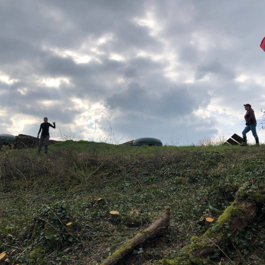 La première équipe s’est occupée du bloc 5, situé au sommet de la colline. Bien connu des habitants du secteur avec son drapeau, le point de vue de l’observatoire s’était petit à petit obstrué au fil des années. La départementale D1 vers Mondorff en particulier, route déjà stratégique en 1940, n’était plus visible. Grosse opération de tronçonnage et débroussaillage, et après une journée de dur labeur la vue se dégage déjà ! Encore quelques heures de travail et les promeneurs pourront à nouveau profiter de l’un des meilleurs points de vue de la région. ![]()